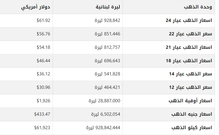 تعرف على أسعار الذهب في لبنان اليوم الأحد 24 سبتمبر 2023