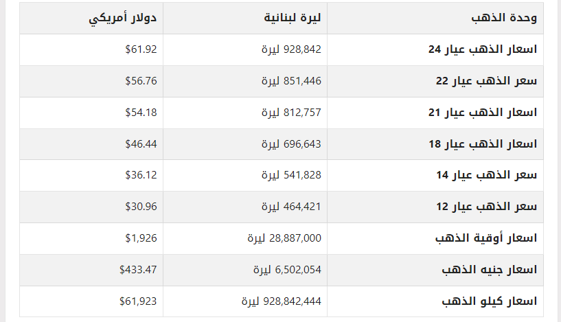 كم يبلغ سعر جرام الذهب في لبنان اليوم الاثنين 25 سبتمبر 2023؟
