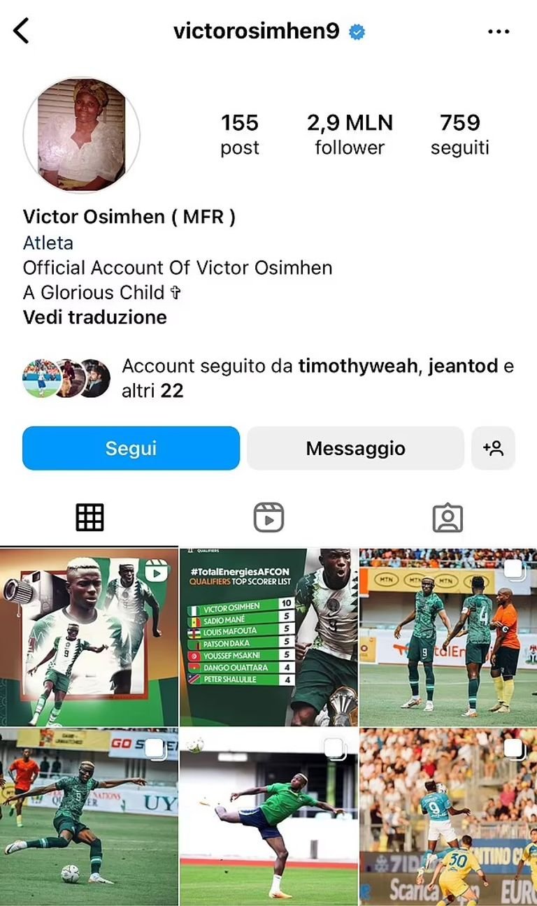 واكتفى أوسيمين بالصور التي يتواجد فيها مع زملائه في المنتخب النيجيري، أو وهو يلعب مع النسور الخضر، مع الاحتفاظ بمنشور واحد مرتبط ببطل إيطاليا.