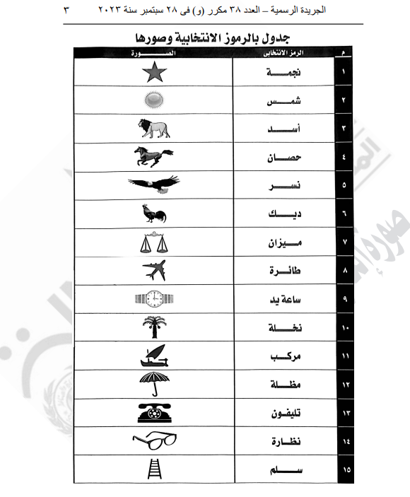 وتضمن جدول الرموز الانتخابية رمز النجمة والشمس والأسد والحصان والنسر والديك والميزان والطائرة وساعة اليد والنخلة والمركب والمظلة والتليفون والنظارة والسلم.