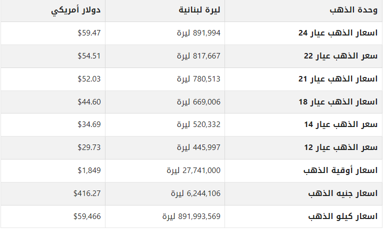 أسعار الذهب في لبنان اليوم