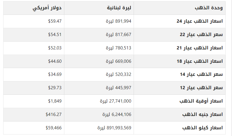 أسعار الذهب في لبنان اليوم