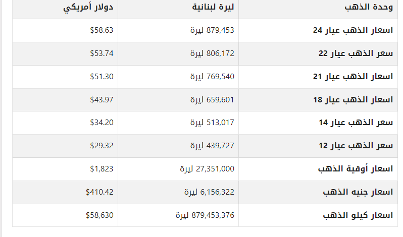 أسعار الذهب في لبنان اليوم