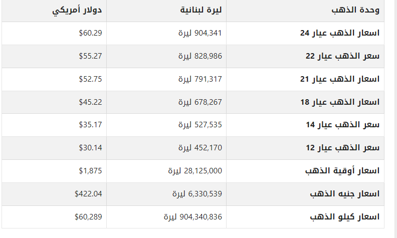 أسعار الذهب في لبنان اليوم