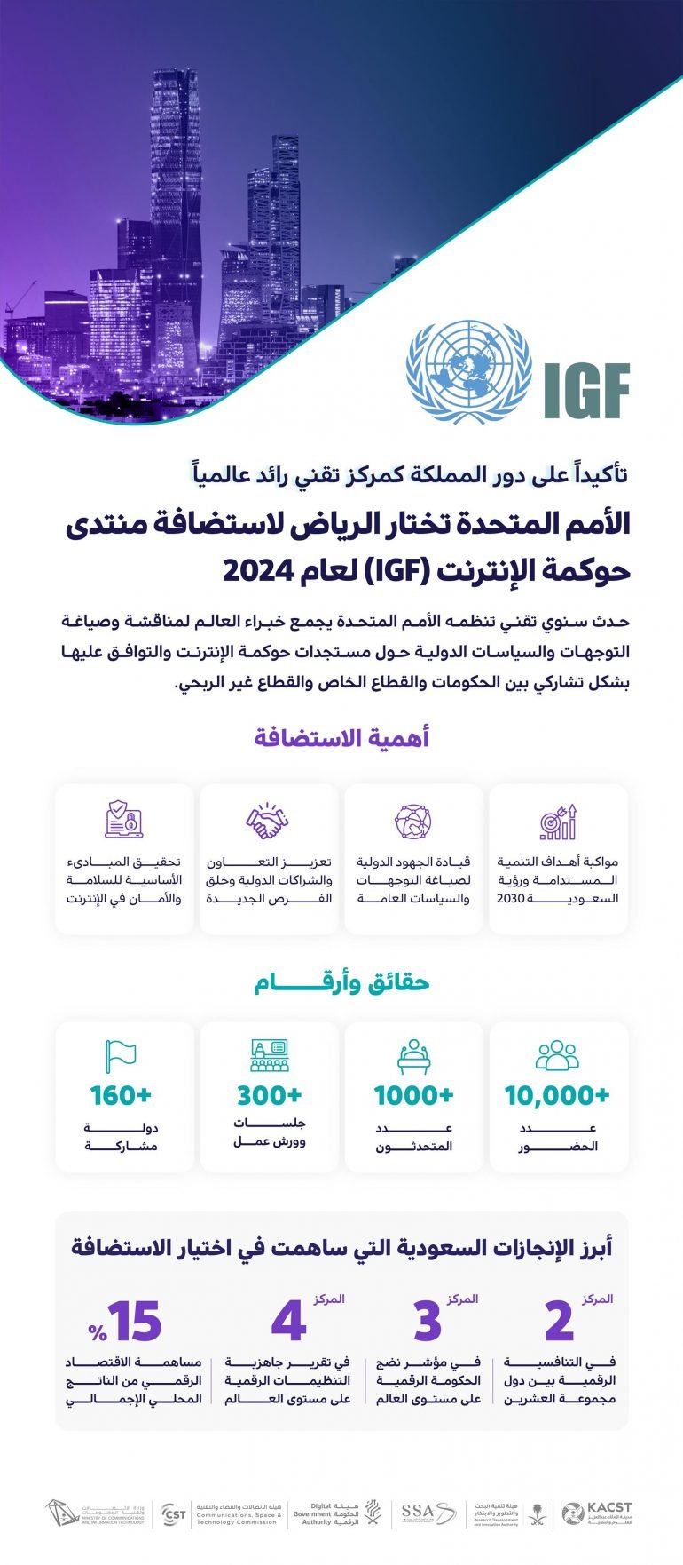 اختارت الأمم المتحدة الرياض، لاستضافة المنتدى العالمي لحوكمة الإنترنت “IGF” في دورته الـ 19 لعام 2024، الذي تنظمه الأمم المتحدة بشكل سنوي، وتجمع فيه الخبراء من دول العالم لمناقشة وصياغة التوجهات والسياسات الدولية حول مستجدات حوكمة الإنترنت والتوافق عليها بشكل تشاركي بين الحكومات والقطاع الخاص والقطاع غير الربحي.