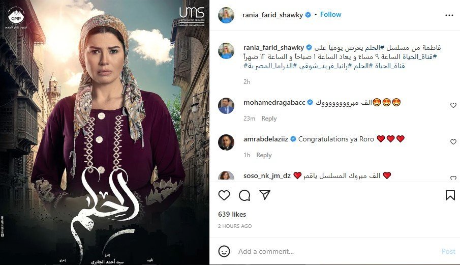 وكتبت:" فاطمة من مسلسل "الحلم" يعرض يوميا الساعة 9 مساءً".