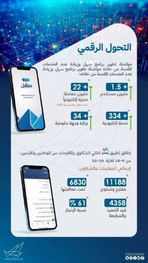 وأعلن مركز التواصل الحكومي عن مواصلة برنامج سهل في تطوير خدماته وزيادة عددها حيث يصل عدد مستخدميه إلى أكثر من 1.5 مليون مستخدم وحقق أكثر من 22 مليون معاملة إلكترونية.