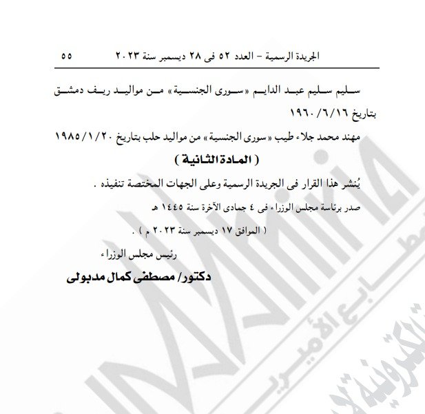 منحت الحكومة المصري جنسية البلاد لستة مواطنين سوريين، حسب ما ورد في الجريدة الرسمية وقرار رئيس مجلس الوزراء رقم 4876 لسنة 2023.