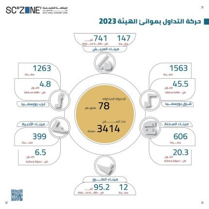أيضا استقبل ميناء غرب بورسعيد التابع للمنطقة الاقتصادية 1263 سفينة متنوعة بطاقة محققة بلغت 4، 78 مليون طن وعدد حاويات 456 ألف حاوية مكافئة خلال عام 2023.
