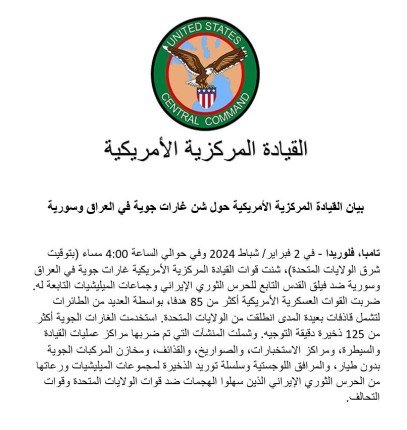 من جهته، قال الرئيس الأميركي جو بايدن إنه أصدر توجيهات بتنفيذ ضربات عسكرية على منشآت في العراق وسوريا تخص الفصائل التي هاجمت القوات الأميركية، وأضاف أن الرد سيستمر. وقال بايدن في بيان «ردنا بدأ اليوم. وسيستمر في الأوقات والأماكن التي نحددها»