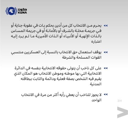 ويشترط لممارسة حق الانتخاب والترشيح الالتزام بأحكام الدستور والقانون والشريعة الإسلامية، حسب الباب الأول من المرسوم.