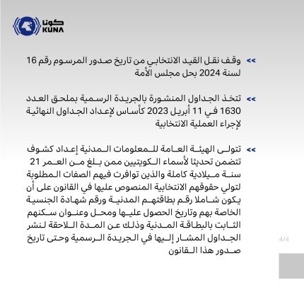 وبموجب المادة الأولى من المرسوم الذي حمل الرقم 4 لسنة 2024 والصادر اليوم الأربعاء 21 فبراير 2024 "يوقف العمل بأحكام القانون رقم 120 لسنة 2023 في شأن انتخابات أعضاء مجلس الأمة المشار إليه مؤقتا حتى تاريخ 1 أكتوبر 2024، وفق الجريدة الرسمية «الكويت اليوم»، في ملحق العدد رقم 1675 الصادر اليوم الخميس.
