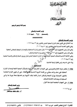 وأصدر وزير الصحة المصري هذا الأسبوع قرارا لتخصيص (٢٥٪ فقط ) علاج مجاني للمستشفيات والمراكز الطبيه (بالمحليات) ووفق القانون الاداره المحليه ١٥٩.و ٧٥٪ للعلاج بالأجر في المستشفيات المذكوره دون الادويه وفق نفقه الدوله والتأمين الصحي القديم.