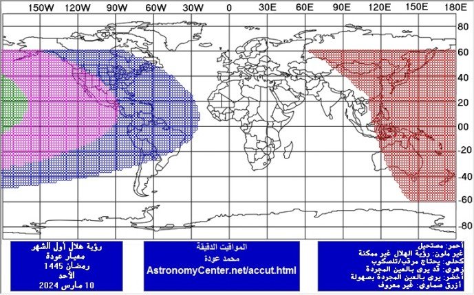 أما بالنسبة لإمكانية رؤية الهلال يوم الأحد 10 مارس، واستنادا على جميع معايير رؤية الهلال المنشورة في أبحاث علمية محكمة (ومنها معيار العالم المسلم ابن طارق، والباحث فوثرينغهام، والباحث ماوندير، والباحث بروين، والباحث المسلم إلياس، والمرصد الفلكي SAAO، والباحث يالوب، والباحث المسلم عودة)، فإن رؤية الهلال غير ممكنة في ذلك اليوم من أي مكان في العالم العربي والإسلامي سواء بالعين المجردة أو باستخدام التلسكوب، في حين أن رؤية الهلال ممكنة باستخدام التلسكوب من أجزاء من الأمريكيتين، خاصة من الأجزاء الغربية. وبناء على ذلك وبالنسبة للدول التي تشترط الرؤية الصحيحة للهلال من مكان ما في العالم الإسلامي، فمن المتوقع أن تبدأ هذه الدول شهر رمضان يوم الثلاثاء 12 مارس.