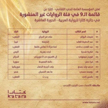«اسليمة» تصطحب العابد إلى القائمة القصيرة لجائزة كتارا