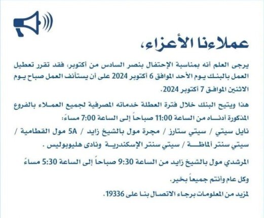 وقال البنك، في بيان عبر صفحته الرسمية على موقع التواصل الاجتماعي فيسبوك، إنه بمناسبة الاحتفال بذكرى نصر السادس من أكتوبر فقد تقرر تعطيل العمل بالبنك اليوم الأحد، على أن يستأنف العمل صباح غدٍ الاثنين 7 أكتوبر 2024.