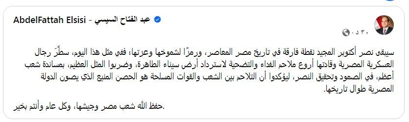 قال الرئيس المصري عبد الفتاح السيسي، عبر حسابه الرسمي علي موقع التواصل الاجتماعي "فيسبوك": "سيبقى نصر أكتوبر المجيد نقطة فارقة في تاريخ مصر المعاصر، ورمزًا لشموخها وعزتها، ففي مثل هذا اليوم، سطَّرَ رجال العسكرية المصرية وقادتها أروع ملاحم الفداء والتضحية لاسترداد أرض سيناء الطاهرة، وضربوا المثل العظيم، بمساندة شعب أعظم، في الصمود وتحقيق النصر، ليؤكدوا أن التلاحم بين الشعب والقوات المسلحة هو الحصن المنيع الذي يصون الدولة المصرية طوال تاريخها. حفظ الله شعب مصر وجيشها، وكل عام وأنتم بخير.