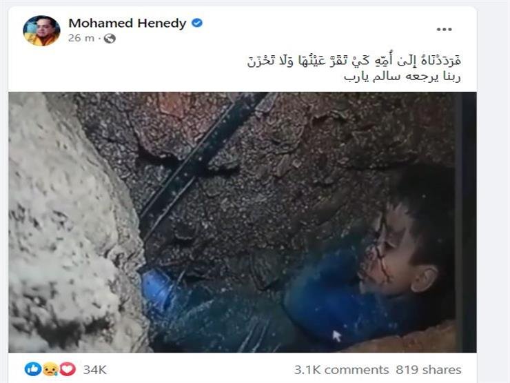 ونشر الفنان محمد هنيدي، صورة، عبر موقع التواصل الاجتماعي فيسبوك، للطفل المغربي ريان، داعيا الله أن يرجعه سالما لأهله، مضيفا: «فَرَدَدْنَاهُ إِلَىٰ أُمِّهِ كَيْ تَقَرَّ عَيْنُهَا وَلَا تَحْزَنَ.. ربنا يرجعه سالم يارب».