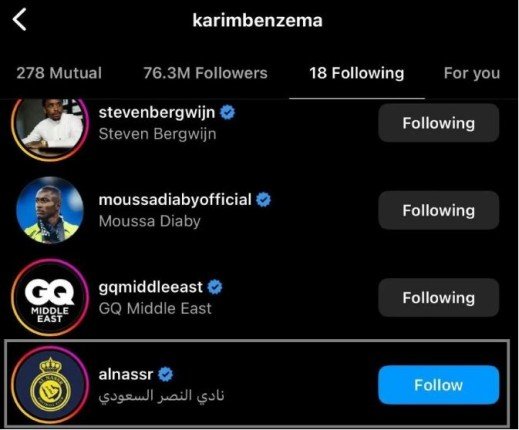 ولكن بنزيما أغلق الباب سريعا بعدما ألغى المتابعة لحساب نادي النصر عبر موقع "إنستجرام".