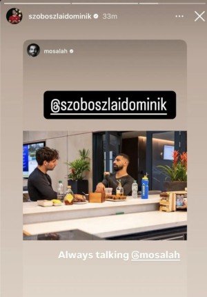 ونشر سوبوسلاي صورة له عبر خاصية "ستوري" بحسابه الرسمي على منصة "إنستجرام" كان جالسا فيها مع محمد صلاح وكتب عليها ساخرا: "يتحدث كثيرا.