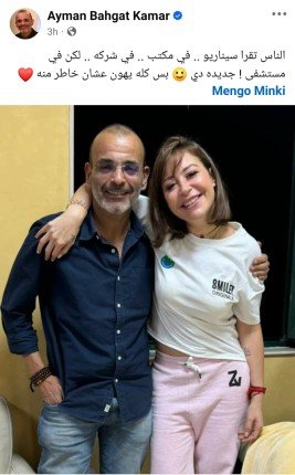 وكتب أيمن بهجت قمر، عبر حسابه بموقع التواصل الاجتماعي «فيس بوك»: «الناس تقرأ سيناريو.. في مكتب.. في شركة.. لكن في مستشفى! جديدة دي بس كله يهون عشان خاطر منة».