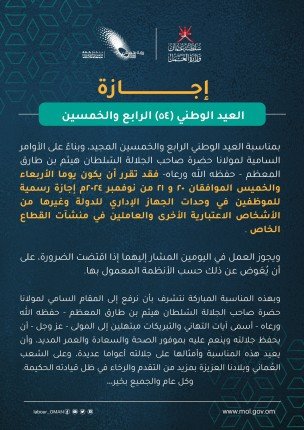 أعلنت وزارة العمل العمانية أن عطلة العيد الوطني الـ 53 ستصادف يومي الأربعاء والخميس 20 و21 نوفمبر الجاري، بناءً على أوامر سامية من سلطان عمان السلطان هيثم بن طارق.