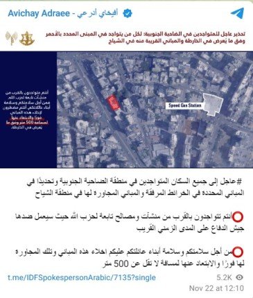 وأضاف البيان: "لضمان سلامتكم وسلامة عائلاتكم، عليكم إخلاء هذه المباني والمناطق المجاورة فورًا والابتعاد عنها لمسافة لا تقل عن 500 متر".