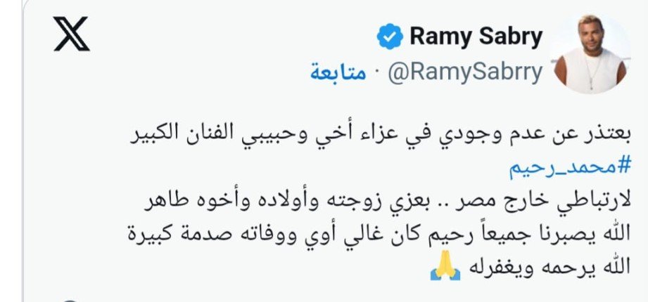 ونشر رامي صبري على موقع "X" تغريدة أوضح من خلالها سبب غيابه: "أعتذر عن عدم وجودي في عزاء أخي وحبيبي الفنان الكبير محمد رحيم لارتباطي خارج مصر. أعزي زوجته وأولاده وأخوه طاهر. الله يصبرنا جميعًا، رحيم كان غاليًا جدًا، ووفاته صدمة كبيرة. الله يرحمه ويغفر له".