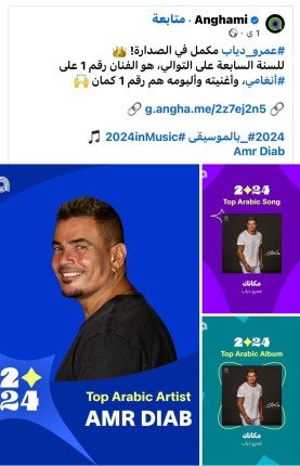 وكتبت المنصة عبر صفحتها على فيسبوك: "عمرو_دياب مكمل في الصدارة! للسنة السابعة على التوالي، هو الفنان رقم 1 على #أنغامي، وأغنيته وألبومه هم رقم 1 كمان".