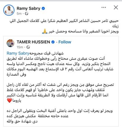 تفاعل رامي صبري مع تدوينة تامر حسين برد إيجابي، حيث كتب: