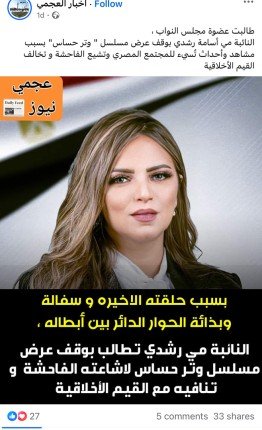 تقدمت النائبة مي أسامة رشدي، عضو مجلس النواب، ببيان عاجل إلى رئيس المجلس المستشار حنفي جبالي، طالبت فيه بوقف عرض المسلسل، مؤكدة أن محتواه "يسيء إلى المجتمع المصري وقيمه".
