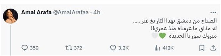 كتبت الفنانة أصالة: "مانمت بس مرتاحه وعندي صحوة بتنسيني النوم ليالي طويلة مبروك فرحة أهلي وأحبابي الطيبين اللي عم يحافظوا على الفرح يعلى صوته ويوصل لحدود السما مبروك يا شباب سوريا العظام يا مستقبل بيليق باسم سوريا العظيمة".