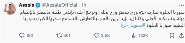 وتابعت أصالة: "سوريا الحلوة صارت حرة ورح تتعمر ورح تحلى وترجع أحلى بإيدين طيبه ما بتفكر بالإنتقام وبتشوف بكره الأحلى وكلنا إيد بإيد نزين بالحب بالتعايش بالتسامح سوريا الكبرى سوريا الطيبه سوريا الحلوة".