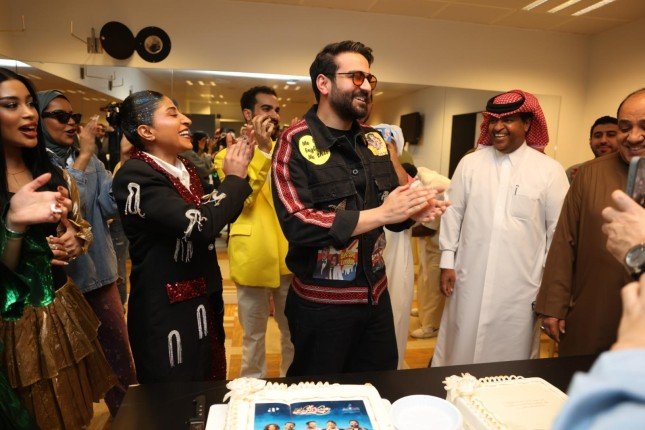 والتف فريق العمل لتقطيع التورتة وأخذ الصور التذكارية وأعربوا عن سعادتهم بالجمهور القطري حيث ان بعضا من الممثلين تعد هذه التجربة الأولى لهم على المسارح القطرية.