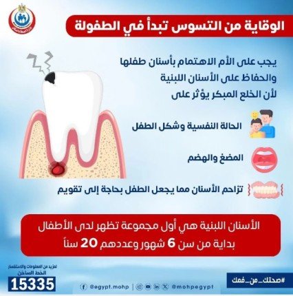 أكدت وزارة الصحة والسكان المصرية، أن الوقاية من التسوس تبدأ في الطفولة ويجب على الأم الاهتمام بأسنان طفلها والحفاظ على الأسنان اللبنية لأن الخلع المبكر يؤثر على الحالة النفسية وشكل الطفل والمضغ والهضم وتزاحم الأسنان مما يجعل الطفل بحاجة إلى تقويم.
