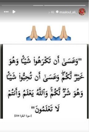 ونشر معلول، عبر خاصية "الاستوري" عبر حسابه الرسمي على موقع التواصل الاجتماعي "إنستجرام"، صورة بقميص الأهلي مدون عليها آية قرآنية من صورة البقرة.. قائلاً: «وعسى أن تكرهوا شيئا وهو خير لكم وعسى أن تحبوا شيئا وهو شرا لكم والله يعلم وأنتم لا تعلمون».