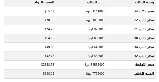 هذه الأسعار من الجمعية الحرفية للصياغة وصنع المجوهرات بدمشق محدثة بتاريخ اليوم الخميس 9 يناير 2025 وتشمل المصنعية، وقد تختلف سعر مصنعية الذهب في سوريا من محل صاغة لآخر