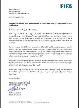 واختتم الأمين العام للفيفا رسالته:" مرة أخرى تهانينا بهذه المناسبة، وأتمنى لك كل النجاح وأتطلع إلى تعاون مثمر معك ومع فريقك في الاتحاد المصري لكرة القدم".