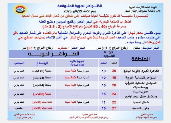 كما توقعت اضطرابات في الملاحة البحرية على البحر الأحمر وخليج السويس وخليج العقبة بسبب ارتفاع الأمواج وسرعة الرياح.