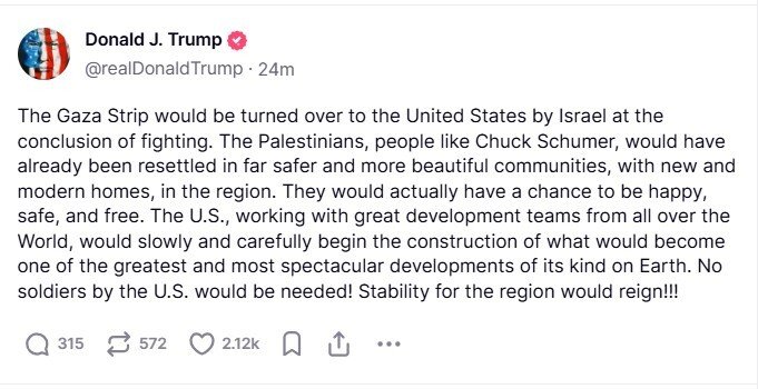 وكتب ترامب عبر منصة "تروث سوشيال": "عند انتهاء القتال، ستنقل إسرائيل قطاع غزة إلى الولايات المتحدة. كان بالإمكان إعادة توطين الفلسطينيين بالفعل في مجتمعات أكثر أمانًا وحداثة، مع منازل جديدة في المنطقة".