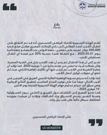 ونشر الاتحاد المنستيري عبر حسابه على موقع التواصل الاجتماعي:« تُعلم الهيئة التسيرية للاتحاد الرياضي المنستيري أنه قد تم الاتفاق على انتقال اللاعب أحمد الخليل إلى نادي الزمالك المصري مقابل مبلغ قدره 500، 000 دولار تصرف على دفعتين، دفعة أولى عند الإمضاء ودفعة ثانية يوم 01.05.2025، مع احتفاظ نادينا بنسبة 20% من قيمة أي انتقال مستقبلي للاعب».