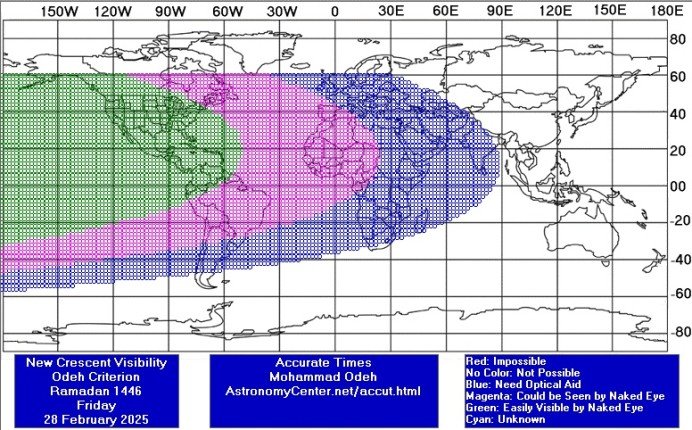ونشر مركز الفلك الدولي خارطة تبين مدى إمكانية رؤية هلال شهر رمضان يوم الجمعة 28 فبراير من جميع مناطق العالم، بحيث أن: