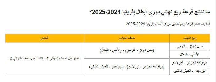 أسفرت قرعة دور ربع نهائي دوري أبطال أفريقيا عن صدام عربي مثير يجمع بين الأهلي المصري حامل اللقب والهلال السوداني في ديربي نهر النيل. فيما يدور صدام مثير آخر بين الجيش الملكي المغربي وبيراميدز المصري في مواجهة عربية أخرى.