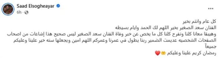 ونشرت الأسرة بيانًا رسميًا عبر الحساب الشخصي للفنان على "فيسبوك"، جاء فيه:"كل عام وأنتم بخير.. الفنان سعد الصغير بخير، اللهم لك الحمد، وأيام قليلة وهيبقى معانا كلنا، ونفرح كلنا، كل ما يخص خبر وفاة الفنان سعد الصغير ليس صحيحًا، هذه شائعات من أصحاب الصفحات الشخصية عديمة الضمير، ربنا يطول في عمرنا وعمركم، اللهم آمين، ويجعلها سنة خير علينا وعليكم جميعًا.. رمضان كريم علينا وعليكم."