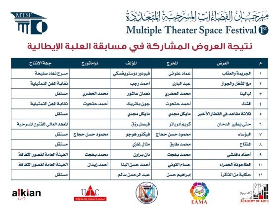 وكشف صدقي عن نتيجة العروض المشاركة في مسابقة العلبة الإيطالية وهم 11 عرضا: «الجريمة والعقاب» إخراج عماد علواني إنتاج مسرح نهاد صليحة، «حتى يطير الدخان» إخراج كريم ادريانو إنتاج المعهد العالي للفنون المسرحية، وعروض إنتاج نقابة المهن التمثيلية: «مع الشغل والجواز» إخراج عبد الباري سعد، «الشك» إخراج أحمد حتحوت، وعروض إنتاج الهيئة العامة لقصور الثقافة: «احفاد دافنشي» إخراج محمد بهجت، «الطاحونة الحمراء» إخراج حسام التوني، ومجموعة من العروض المستقلة هي: «ليالينا» إخراج محمد الحضري، «ثلاثة مقاعد في القطار الاخير» إخراج مايكل مجدي، «البؤساء» إخراج محمود حسن حجاج، «المفتاح» إخراج محمد طارق، «حكاية من الذاكرة» إخراج إبراهيم حسن.