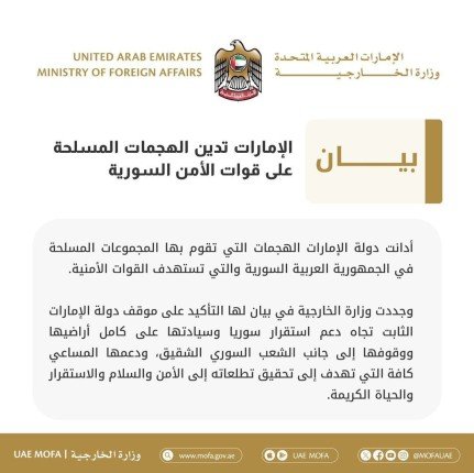 الإمارات تدين الهجمات المسلحة في الساحل السوري وتؤكد موقفها الثابت تجاه دعم استقرار سوريا