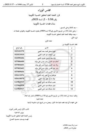 صدر قرار من مجلس الوزراء الكويتي رقم (58/ 5-2) لسنة 2025 بفقدان الجنسية الكويتية من 12 شخصاً.