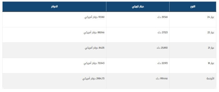 وفيما يلي جدول يعرض أسعار المعدن النفيس بالعملتين المحلية والأجنبية: