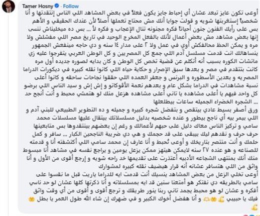 ونشر تامر حسني تعليقًا مطولًا عبر حسابه الرسمي، قال فيه: