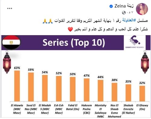 عبرت الفنانة زينة عن سعادتها الكبيرة بتصدر مسلسل"العتاولة 2"، قائمة الأعلى مشاهدة خلال موسم رمضان الحالي، وكتبت عبر حسابها الشخصي بموقع التواصل الاجتماعي "فيسبوك"، قائلة:"مسلسل العتاولة رقم ١ بنهاية الشهر الكريم وفقا لتقرير القنوات، شكرا على كل الحب و الدعم و كل عام و انتم بخير"